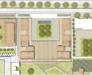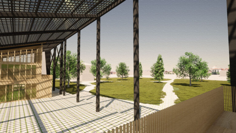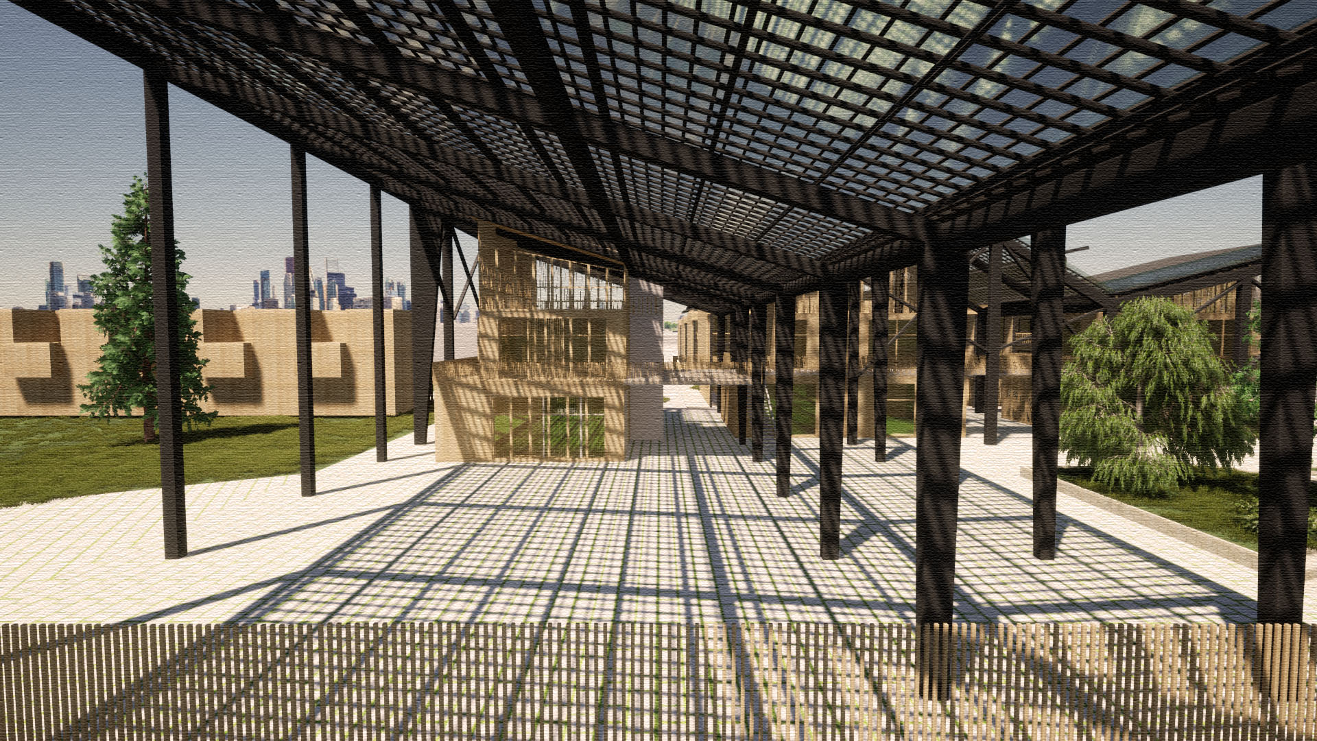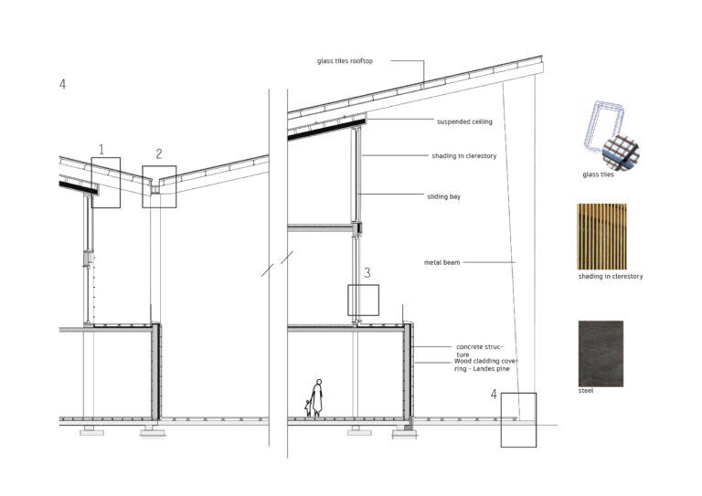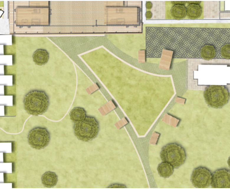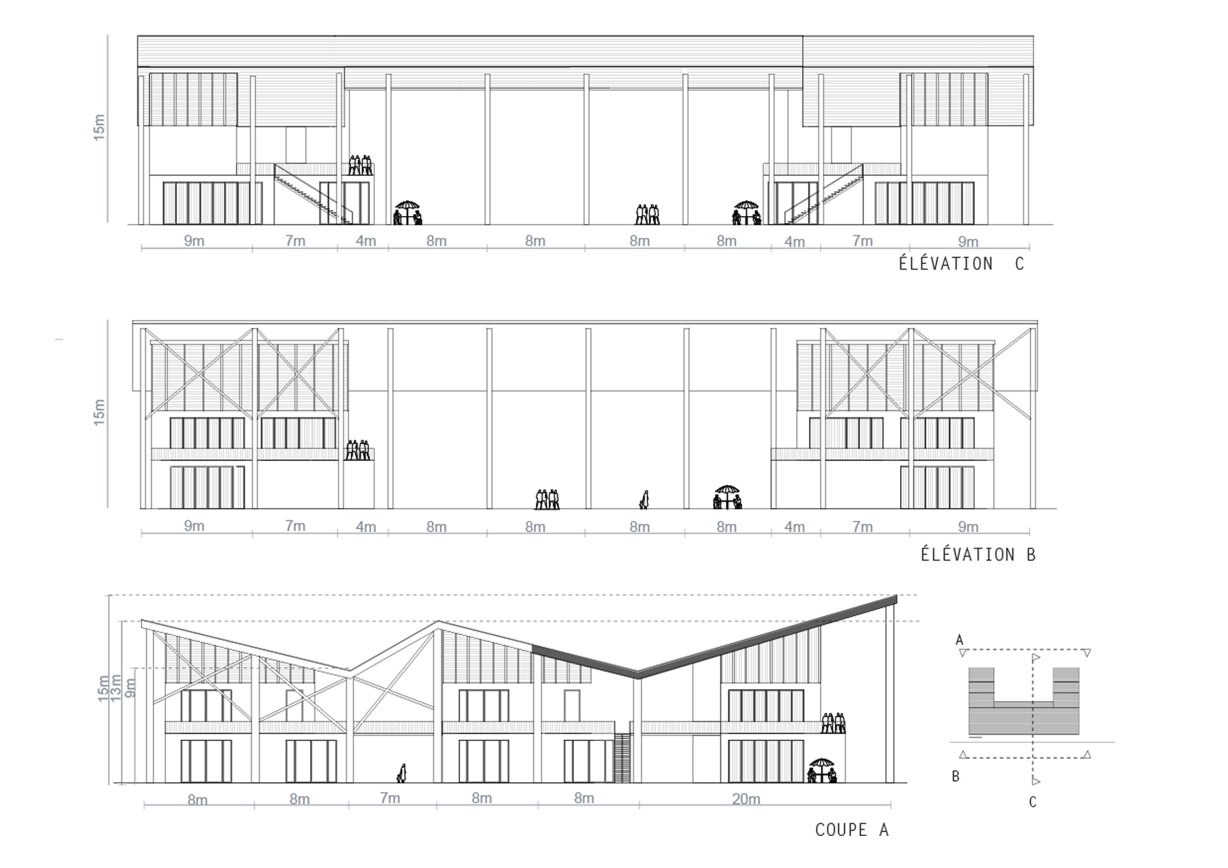 To meet the expectations of the new heart of Marcheprime, a new square has been imagined around which different volumes are arranged, hosting a mixed program of shops, restaurants on the ground floor and spaces for associations or co-working upstairs. It will play the role of a dynamic center in the heart of the city like a village square. Its dynamic roof, made of glass and metal, will connect the different volumes on either side of the square in order to give the inhabitants the feeling of being welcomed and enveloped, before joining to form an open hall which will mark a threshold. between the dynamic place and the pleasure park. If the park as a whole is preserved, a mineral path is however proposed, allowing to connect the station and the media library in order to integrate them more in this new heart of the city. In the center of this treatment of the ground a vegetal space takes shape. One can imagine that ephemeral stands are deployed around it on the occasion of festive events or quite simply for people passing through leaving the station.