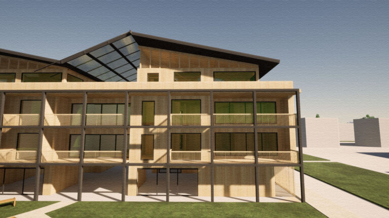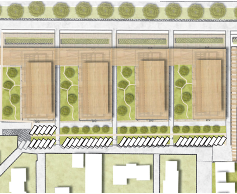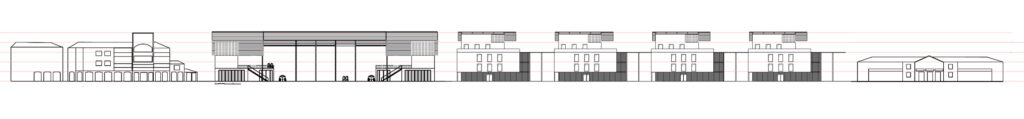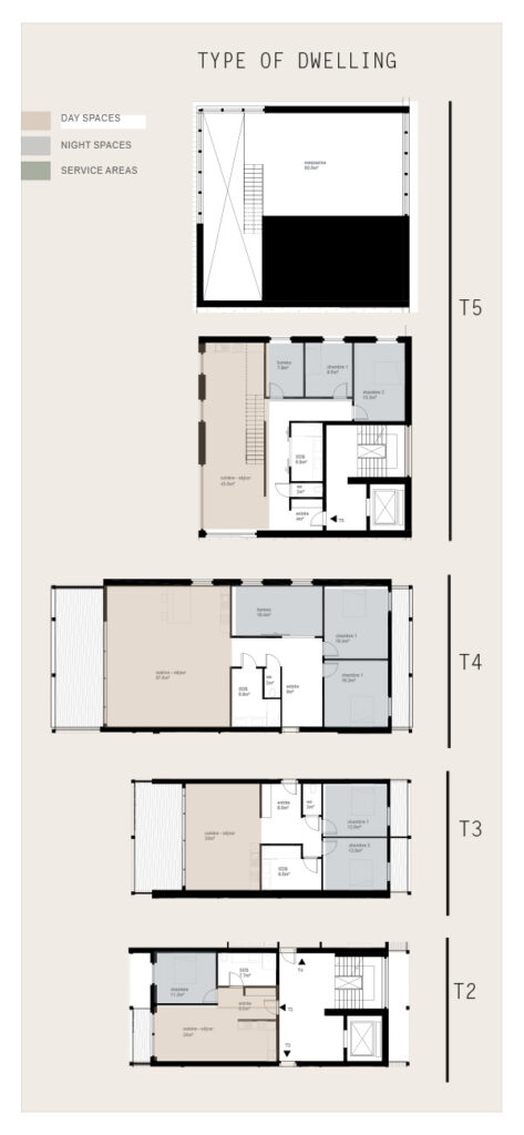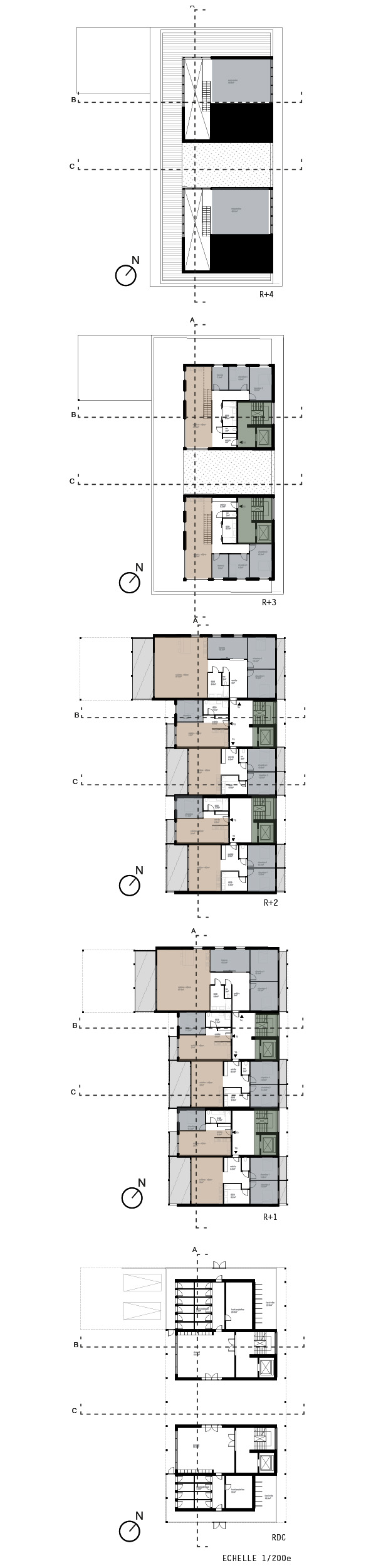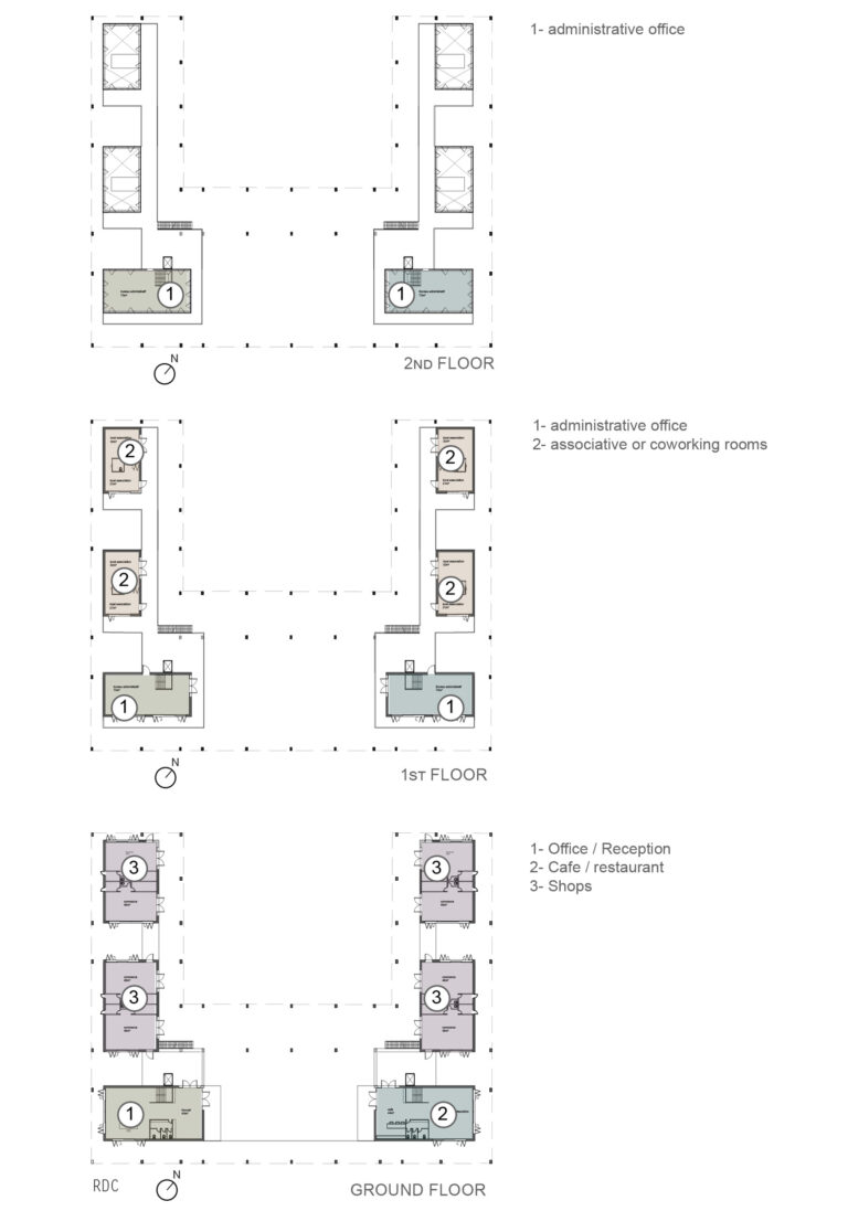 To anticipate the demographic development of the city and to accompany the new changes, a set of collective housing is included in the program. Built according to an L-shaped volumetry, the collective housing can benefit from southern light, as well as align and regularize the street facade. A certain porosity is maintain via large porticoes giving access to common landscaped gardens allowing islands of freshness and the opportunity for the inhabitants to cross paths and meet.. The shape of the roof as well as the materials used are part of the continuity of the new architectural identity of the city. Each building include accommodation ranging from T2 to T5 to accommodate different types of households. The accommodations on the first and second floors are through and each benefit from balconies or terraces overlooking the green gardens. On the third floor are attic accommodation, with furnished terraces suitable for the largest families. Finally, the common areas, such as storage spaces and mailboxes, are located on the ground floor. As for the parking lots, they are present along a green path outside the buildings.