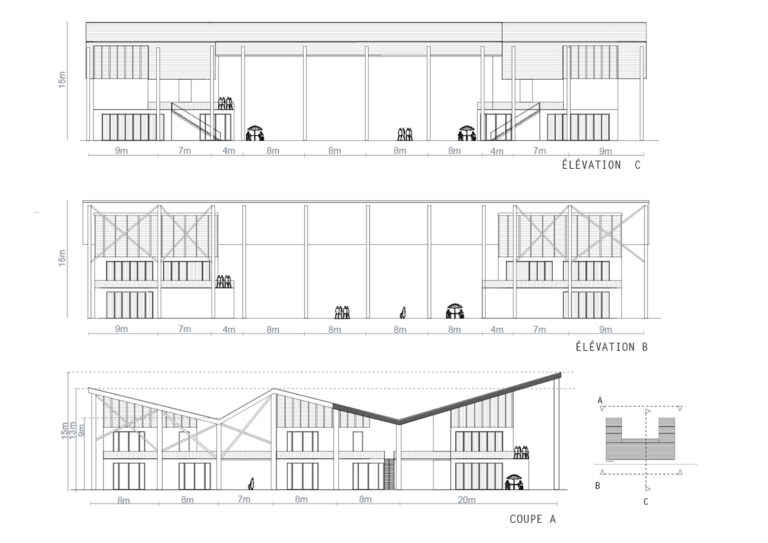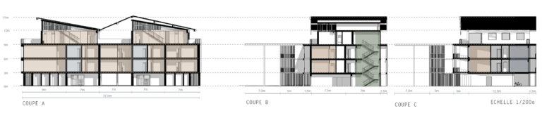 Thus, the project revolves around three developed poles: the housing pole, the commercial and dynamic pole, and the festive and leisure pole. Overall, a connection is established between these three poles through the search for porosity within the architecture. It is also a question of preserving the park from densification and of revaluing it as being the vegetal and breathing lung of the city, of putting forward soft mobility and wandering or strolling through the paths created, but also of favoring the gathering of inhabitants through places of activity and crossroads.